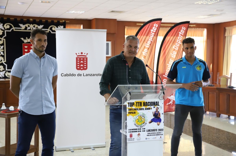 El consejero de Deportes del Cabildo de Lanzarote, Alfredo Mendoza, presentaba hoy en el Salón de Plenos de la Institución la primera edición del Torneo TOP-TTR Nacional de Bádminton, una inédita competición en la Isla que tendrá lugar este fin de semana. El consejero estuvo acompañado por el responsable de Lanzarote Raqueta Club, Óliver Gausmann, y el concejal de Deportes de Arrecife, Rosmen Quevedo.