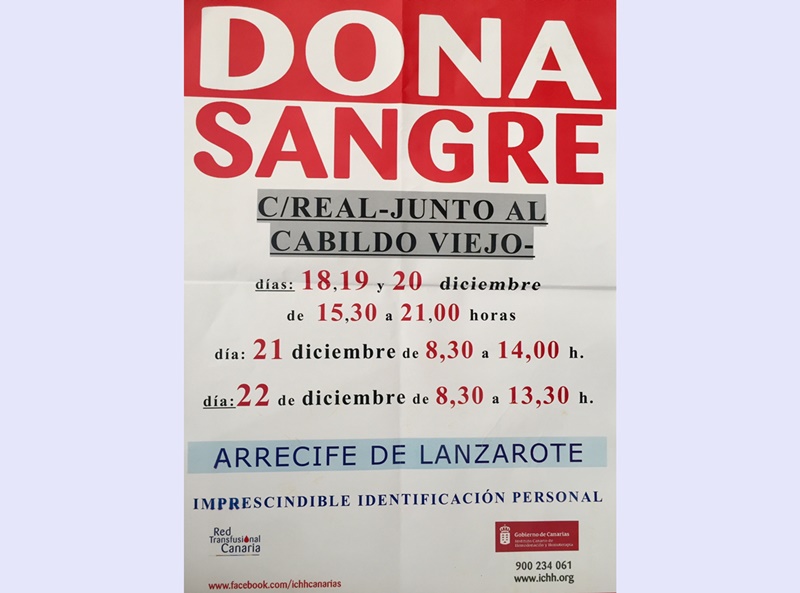 El ICHH recuerda que donar sangre es "vital" en cualquier época del año. El Ayuntamiento de Arrecife anima a todos y a todas a ser solidarios y acercarse a donar y se hace eco del lema del ICHH ‘Dona sangre, dona vida’.