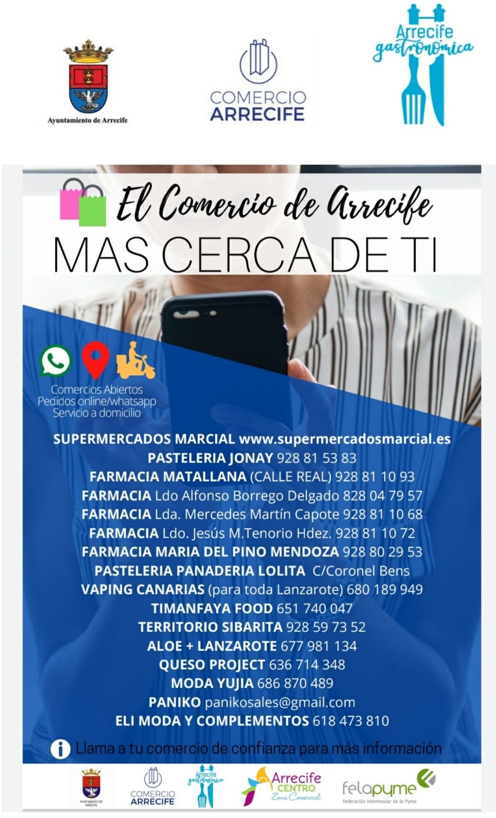 Con carteles informativos, el Área de Comercio y Hostelería de Arrecife, en colaboración con Felapyme y la Cámara de Comercio, se recuerda que existen una serie de empresas de alimentación y otras prestaciones de servicio que en estas semanas de alerta ofrecen su reparto a domicilio.