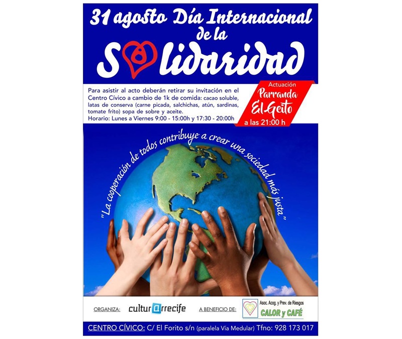 El Ayuntamiento de Arrecife, a través de la Concejalía de Cultura que dirige Rafael Juan González, invita a la ciudadanía a participar en el Día Internacional de la Solidaridad, acudiendo al concierto a beneficio de la Asociación de Acogida y Prevención de Riesgos Calor y Café.