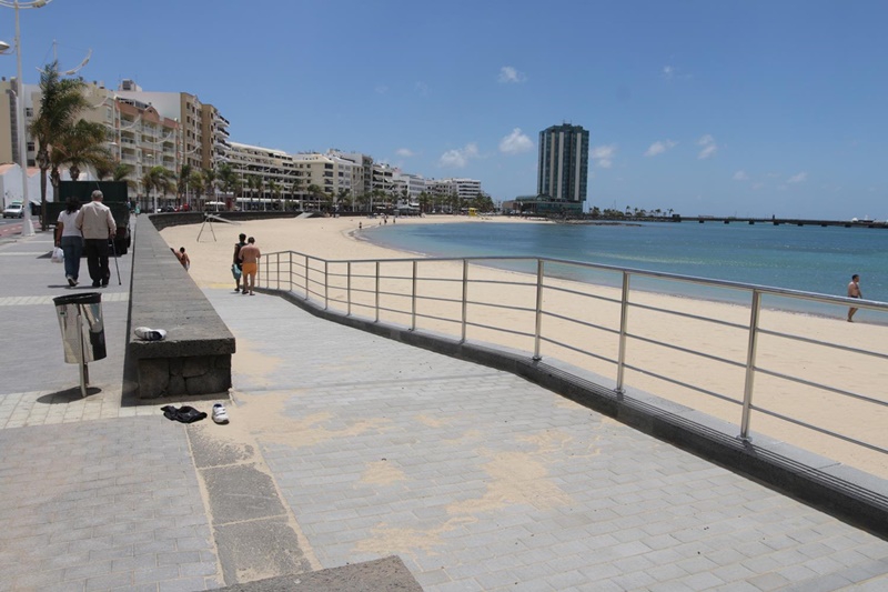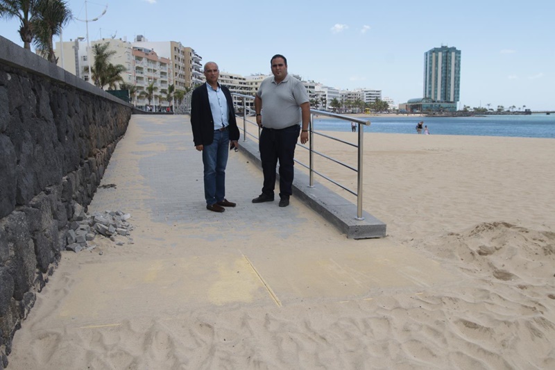 Tras mes y medio de obras, el concejal de Turismo del Ayuntamiento de Arrecife, Rafael Juan González, y el responsable capitalino de Urbanismo (Área responsable de la financiación de las mismas), Samuel Martín, comprobaron la culminación de unos trabajos que permitirán que la principal playa de la capital sea plenamente accesible.