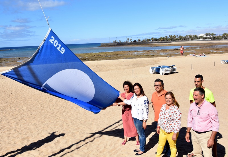 La alcaldesa de Arrecife, Astrid Pérez, y la concejal de Medio Ambiente y Playas, Ángela Hernández, han izado este viernes la bandera azul otorgada a la playa de El Reducto.