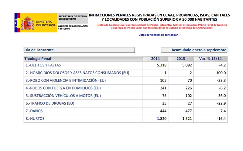 En primer lugar, hay que destacar el incremento en el número de asesinatos en la capital de Lanzarote, del 100%. Al respecto, hay que recordar que se registraron dos crímenes, el de Juan Carlos Tejera, del que se han cumplido ya ocho meses sin haber detenidos, y el de la mujer cubana de 55 años que fue apuñalada en febrero en su casa de Titerroy, cuyo presunto homicida fue arrestado en el aeropuerto cuando se disponía a coger un vuelo de regreso a Tenerife, isla en la que residía.
