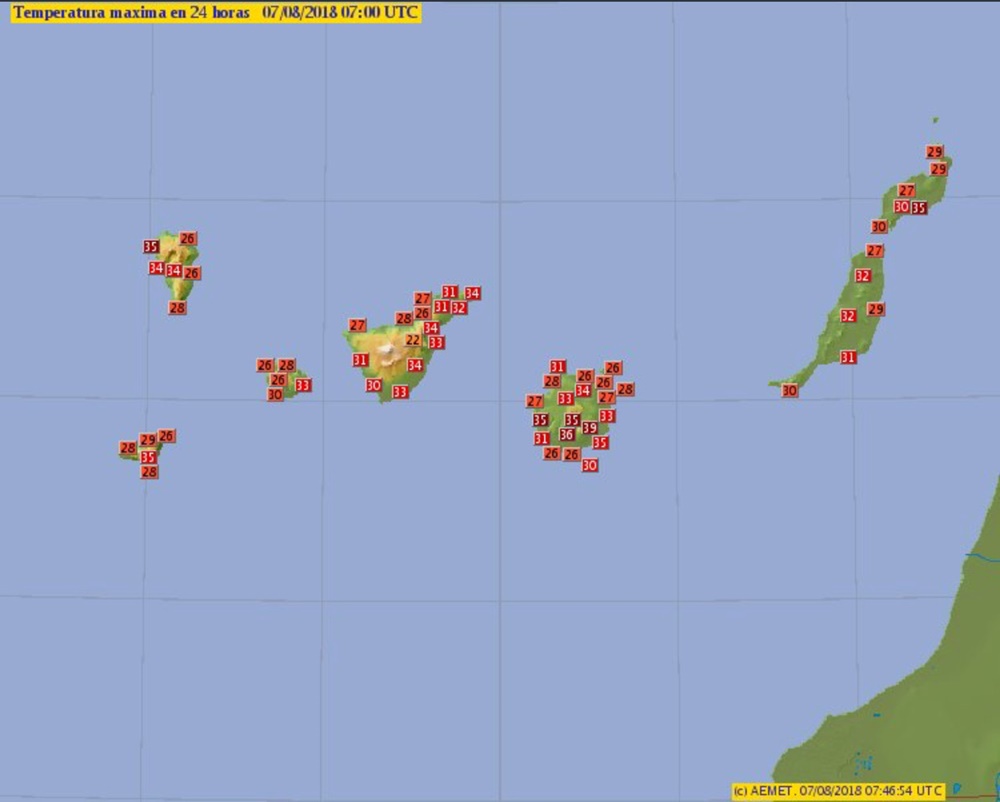 En el aeropuerto, según los termómetros instalados por el Consorcio de Seguridad y Emergencias de Lanzarote, a las 13.20 horas se registraron 35,2 grados; seguidos de la localidad norteña de Haría con 30,9 y Tías que a las 11.00 horas de la mañana marcó 30,3 grados.