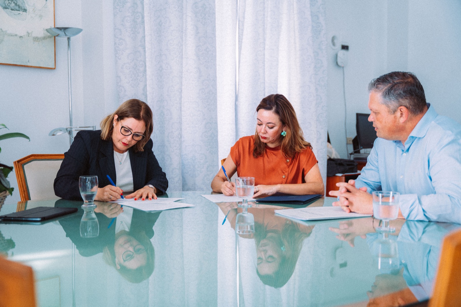 Pérez recibió este lunes, en la Alcaldía del Consistorio capitalino, a la presidenta del Cabildo de Lanzarote, María Dolores Corujo, y al consejero de Deportes, Alfredo Mendoza, procediendo a la firma del acta de recepción de la obra.