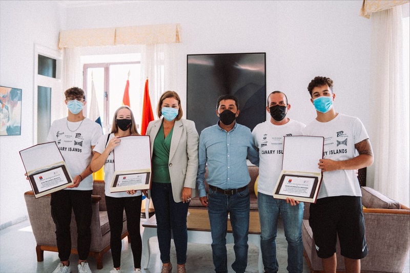 La alcaldesa de Arrecife, Ástrid Pérez, les hizo entrega, junto al concejal de Deportes, Roy González, de unas placas conmemorativas de la hazaña deportiva