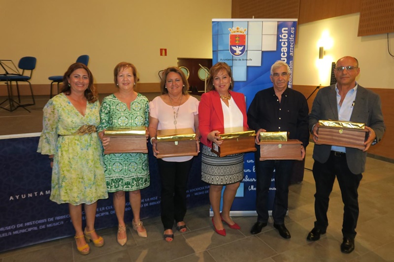 Durante el reconocimiento, que contó con la presencia de la alcaldesa de Arrecife, Eva de Anta, la concejal de Educación, Ascensión Toledo, el edil de Cultura, Rafael Juan González, el director General de Ordenación, Innovación y Promoción Educativa, Juan Rafael Bailón, el director insular de Educación, Mario Pérez, y la consejera de Educación del Cabildo, Carmen Rosa Márquez, entre otra autoridades, los homenajeados recibieron el agradecimiento de todos los presentes además de una caja de madera realizada por artesanos del servicio de carpintería municipal.