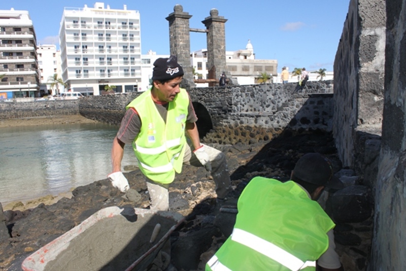 Un cantero profesional y un peón albañil trabajan desde el pasado mes de octubre en la reparación de los muros del borde litoral de Arrecife. El proyecto, que se enmarca en una iniciativa más amplia, destinada a la remodelación de infraestructuras municipales y adecentamiento público, forma parte del programa de convenios del Servicio Canario de Empleo con las Corporaciones locales 2012.