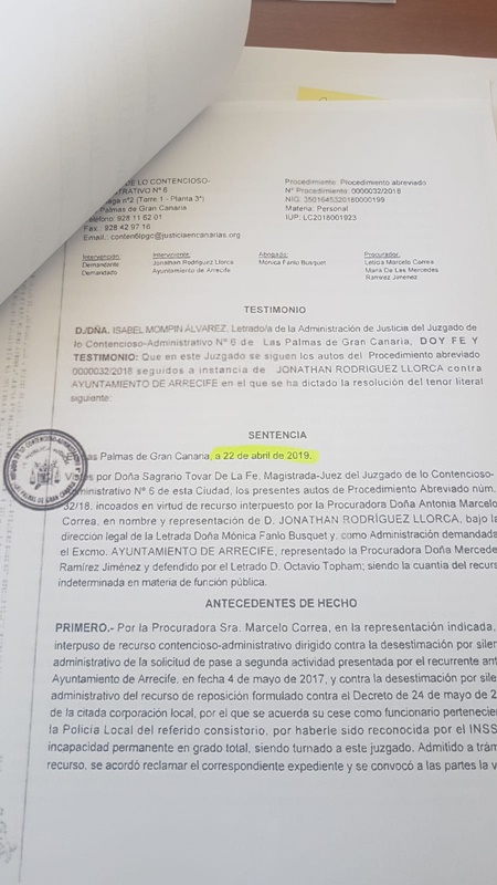 Según destaca el Ayuntamiento en un comunicado, en mayo del 2017 se la había notificado, por el anterior grupo de Gobierno, su cese como funcionario perteneciente a la Policía Local de Arrecife. El agente, contra ese decreto, interpuso un Contencioso Administrativo. La justicia falló a su favor y el pasado 22 de abril de 2019 donde el Juzgado de la Contencioso Administrativo de Las Palmas de Gran Canaria dictó sentencia donde instaba al Ayuntamiento de Arrecife a cumplir con el fallo y proceder al pase a la situación de segunda actividad del agente Rodríguez Llorca.