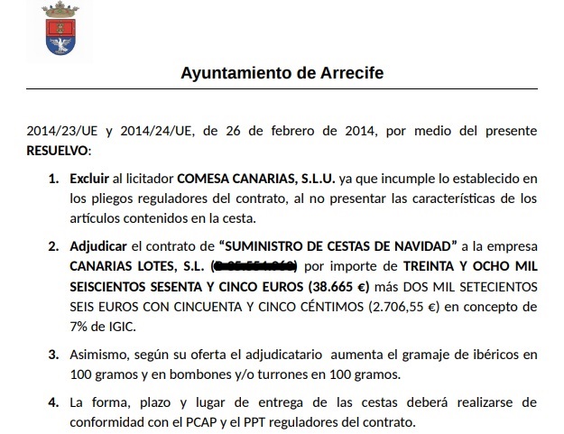 Arrecife se gasta 40.000 euros en cestas navideñas para sus trabajadores