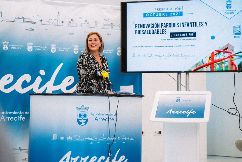 La alcaldesa de Arrecife, Astrid Pérez ha presentado en la mañana de hoy jueves 7 de octubre en rueda de prensa, acompañada por la concejal de Parques Infantiles, Ángela Hernández, las obras de adecuación y legalización de los 44 parques infantiles y zonas biosaludables de los barrios y colegios de Arrecife, que han sido adjudicadas por un importe de 1.389.008,79 euros.