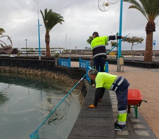 Operarios del Consorcio del Agua ( ente que es el responsable del mantenimiento de la red del alcantarillado en Arrecife) está desplegando efectivos para la retirada de estas toallitas y pañales del interior del Charco de San Ginés. La protección medioambiental de sus aguas imposibilita la utilización de maquinaria y el dragado de sus aguas.