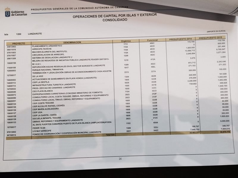 A los 36,9 millones de euros iniciales se añaden 400.000 euros más. Así queda finalmente Lanzarote en los presupuestos regionales para 2015. La isla recibirá en total 37,3 millones de euros, a los que habría que añadir un millón más que Puerto Canarios sumará para el Puerto de Playa Blanca y otros 600.000 euros para la Escuela de Turismo que aparecen en otro capítulo, siendo la primera vez que el Gobierno de Canarias financia parte de este centro educativo.