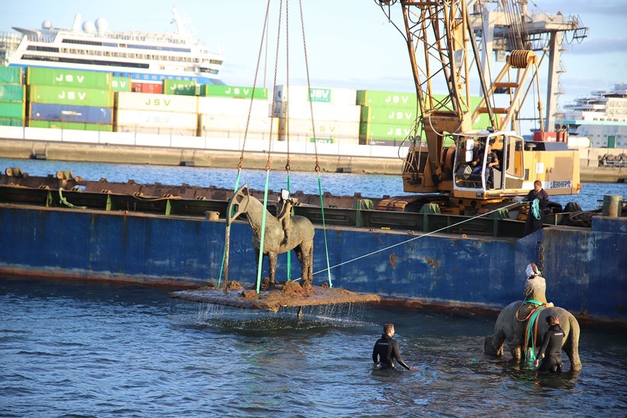 Así, según publican algunos medios de comunicación, esta mujer alemana llamada Susanne Bernard, tras nadar hasta la zona, se aferró durante un buen tiempo a la última obra en ser levantada y durante algunos minutos se vivieron momentos de cierta tensión. Finalmente, el personal encargado de ejecutar los trabajos, adjudicados a la empresa Dragados Canarios, ante la mirada de una par de decenas de curiosos, incluidos algunos amigos de la activista, logró que la mujer se despegara del jinete, acabando en el agua. También otros activistas llegaron al lugar en una lancha rápida y colocaron una soga alrededor de una de las esculturas.