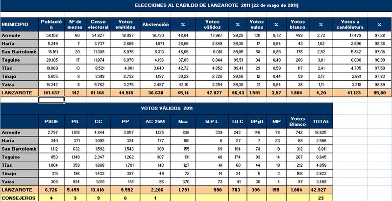 Las urnas esperan este domingo en Lanzarote a las más de 90.000 personas que están llamados a votar en unos comicios electorales marcados por la aparición de nuevos partidos como Podemos y Ciudadanos que, según las encuestas, irrumpirán con fuerza en las instituciones. La abstención, por su parte, será el enemigo de todos ellos, pues en las últimas elecciones al Cabildo llegó a ser del 45,14%, es decir, de las 81.148 personas llamadas a las urnas, 36.630 decidieron no ir a votar. A ello se sumaron 1.591 votos nulos (3,57%) y 1.804 votos en blanco (4,2%).