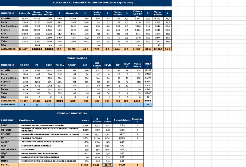 En lo que se refiere a las votaciones al Parlamento, CC consiguió cuatro diputados por Lanzarote, al obtener 14.901 votos, mientras el PP obtuvo 9.582 votos y dos parlamentarios. PSOE y PIL consiguieron un diputado cada uno.