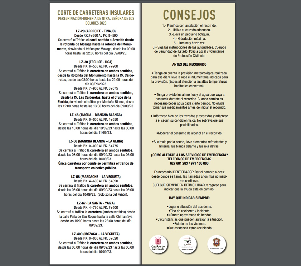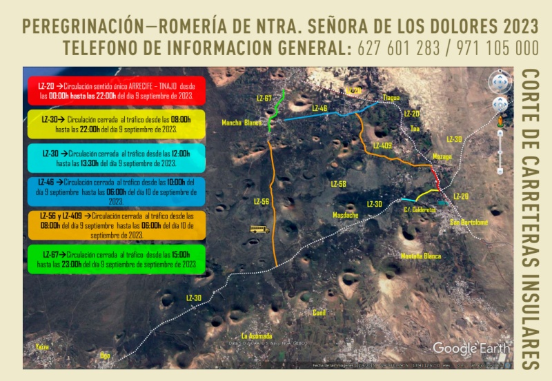 - LZ 67 (Yaiza-La Santa): Circulación cerrada al tráfico desde las 15:00h hasta las 23:00h del día 10 de septiembre.