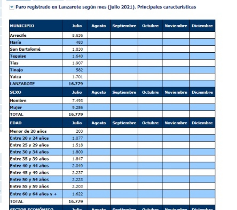 Por municipios, Arrecife acababa julio con 8.636 desempleados frente a los 9.851 de junio, lo que supone 1.215 menos. En Haría se ha pasado de los 524 de junio a 483, 41 parados menos. En el caso de San Bartolomé el paro se ha reducido en 219 personas, pasando de los 2.049 de junio a los 1.830 de julio.