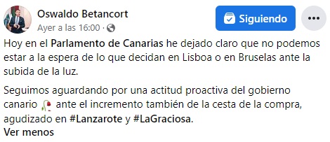 Betancort considera insostenible la situación económica producida la subida de la electricidad y también de la cesta de la compra que supone un gasto mayor, aproximadamente de un 23%, en Lanzarote y La Graciosa.