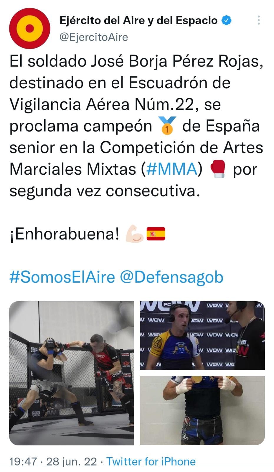 El lanzaroteño José Borja Pérez Rojas se ha proclamado campeón de España Senior en la Competición de Artes Marciales Mixtas por segundo año consecutivo. Así lo publicaba en sus redes sociales el Ejército del Aire, ya que José Borja está destinado en el escuadrón de vigilancia aérea número 22.