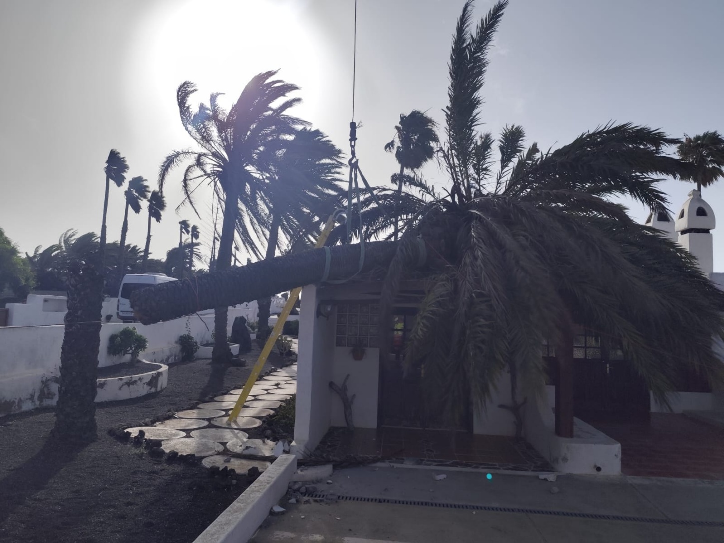 La fuerza del viento hizo que una palmera cayera sobre una pérgola en la zona de Las Cabreras, en Teguise. Fue un empleado del propio centro de mayores el que alertó a los Bomberos por temor al riesgo que suponía para los usuarios de las instalaciones.
