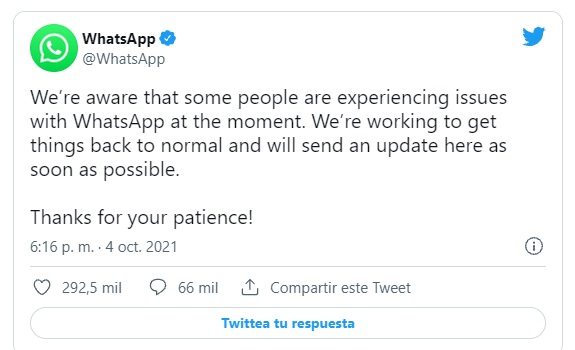 Los responsables de la aplicación de mensajería han sido los primeros en admitir el problema a través de su cuenta oficial en Twitter unos 30 minutos después de que usuarios de todo el mundo informaran de la incidencia: "Somos conscientes de que algunas personas están experimentando problemas con WhatApp en este momento. Estamos trabajando para que todo vuelva a la normalidad y actualizaremos la información por aquí lo antes posible. ¡Gracias por su paciencia!", han explicado.