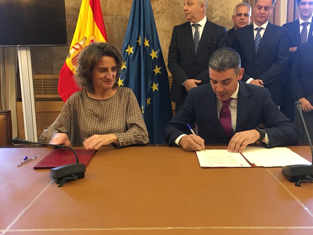 El consejero de Agricultura, Ganadería, Pesca y Aguas del Gobierno de Canarias, Narvay Quintero, y la ministra de Transición Ecológica, Teresa Ribera, han firmado en la mañana de hoy el protocolo de obras hidráulicas para Canarias que permitirá recibir del Estado 915 millones de euros en los próximos 12 años con el objetivo de desarrollar definitivamente el Ciclo Integral del Agua en las Islas. Quintero, que estaba acompañado por el director general de Aguas, Juan Ramón Felipe, ha manifestado que esta firma supone la plasmación de “un trabajo del Gobierno de Canarias desde 2015 de coordinación con todas las administraciones locales e insulares del Archipiélago que “han ido aportando su planificación para los próximos años y que recoge este documento ahora firmado”.