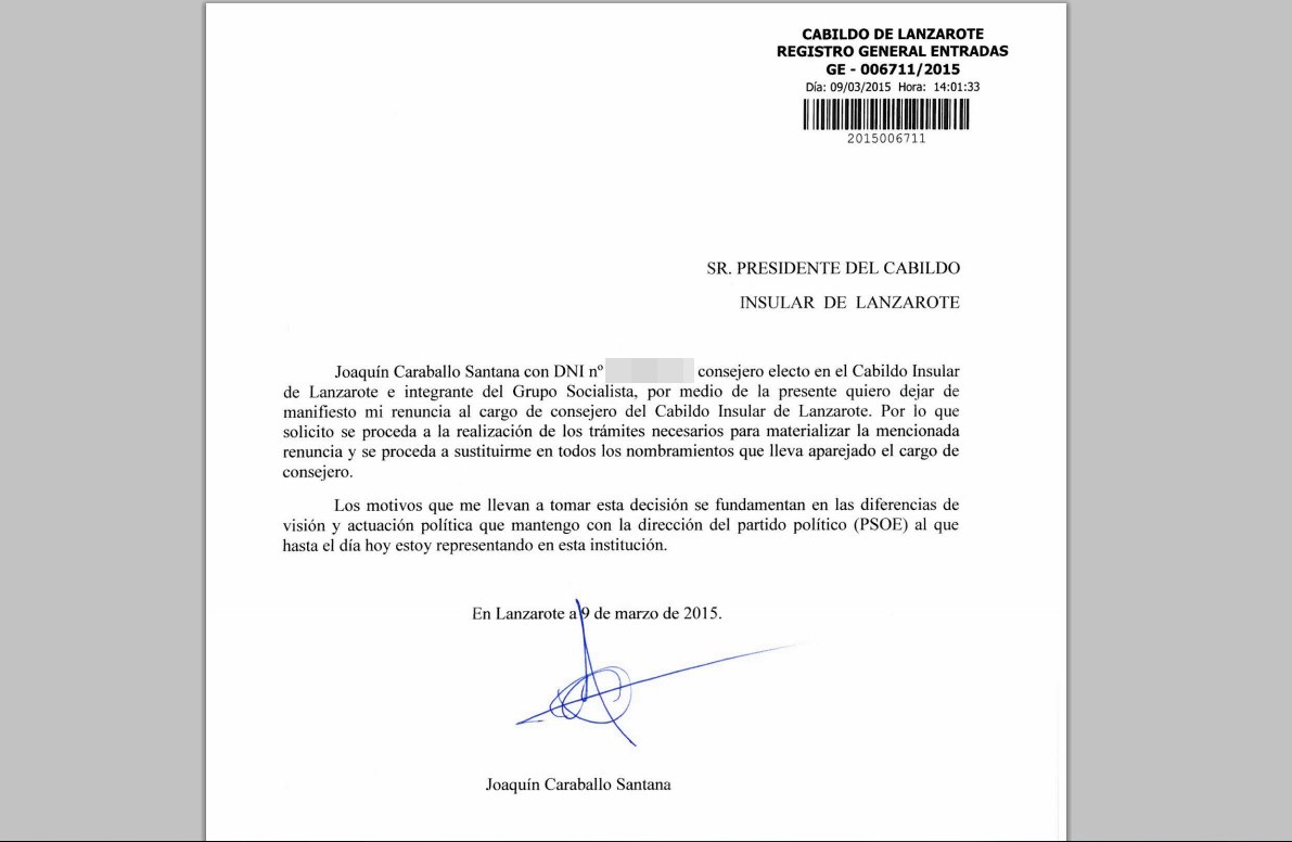 Joaquín Caraballo ya ha presentado su renuncia como consejero en el Cabildo, en la que afirma que dimite "por las diferencias de visión y actuación política" que mantiene con la dirección del PSOE".