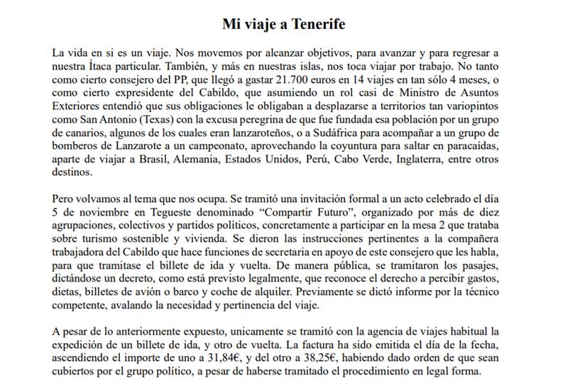 El consejero de Empleo y Vivienda del Cabildo de Lanzarote ha enviado un carta a Lancelot Medios para dar su punto de vista sobre la polémica que le está sobrevolando en los últimos días derivada de una denuncia del Partido Popular sobre un viaje a Tenerife.