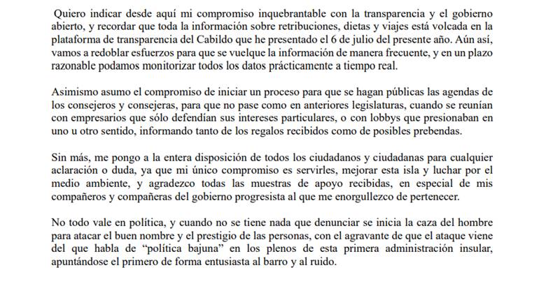 En la misiva, Peñas no asume que cometió un error al viajar a Tenerife, corriendo los lanzaroteños con los gastos, pues se trataba de un acto político claramente partidista. "No todo vale en política, y cuando no se tiene nada que denunciar se inicia la caza", explica.