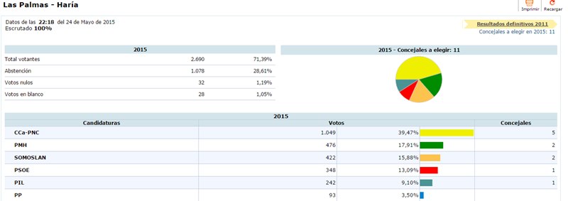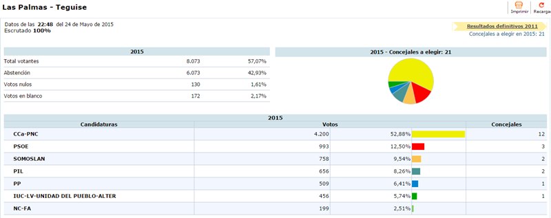 Buenos datos para CC en estas elecciones, donde ha arrasado en Teguise y Tinajo obteniendo la mayoría absoluta, al tiempo que ha dado la sorpresa en Haría, donde Marci Acuña se ha impuesto obteniendo cinco concejales, frente a los dos que se ha llevado la Plataforma del Municipio de Haría de Torres Stinga, a quien más que ha doblado en votos al obtener 1.049 frente a los 476 que se ha llevado el hasta ahora alcalde del municipio. Somos Lanzarote ha conseguido también dos ediles, mientras que el PIL se ha quedado con uno de los dos que tenía. A los nacionalistas les faltaría sólo un concejal para tener la mayoría absoluta, por lo que podrían aliarse con cualquiera de las formaciones políticas.