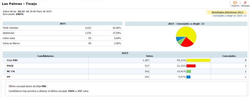 También ha vencido CC en Tinajo, donde Jesús Machín ha revalidado su mayoría absoluta con ocho concejales al conseguir 1.387 votos. El PSOE consigue un concejal más y se queda con tres, mientras Nueva Canarias entra en la institución con uno. y el PP mantiene el que tenía. "Me lo esperaba, porque era lo que me decía la gente. El pueblo de Tinajo no quería cambiar de alcalde", ha señalado "contento e ilusionado" el vencedor nada más conocer los resultados. "Ha ganado Tinajo", cree Machín.