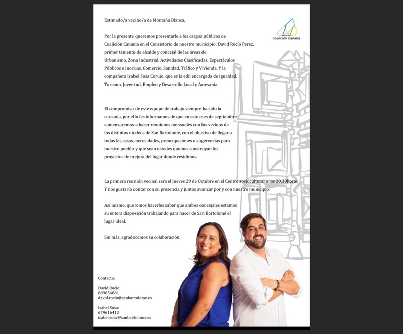 A su vez trasladarle a todos los vecinos que ambos ediles están a su entera disposición para que lo que necesiten trabajando por San Bartolomé.