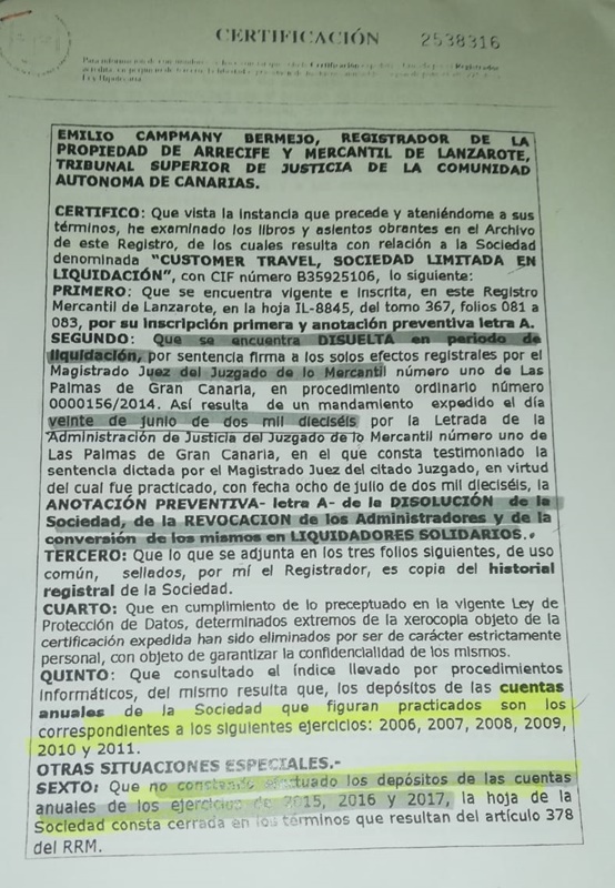 Se trata de la empresa de la pareja de Juan Félix Eugenio que adeuda más de 500.000 euros a los Centros Turísticos./ Vea el documento oficial de la disolución