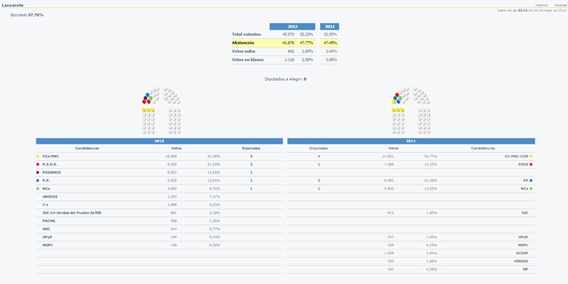 CC se ha situado como la fuerza más votada en Canarias consiguiendo 18 diputados, tres de los cuales los ha logrado por Lanzarote, donde también ha sido el partido más votado, aunque ha perdido un parlamentario. El PSOE, por su parte, se ha situado como segunda fuerza, con 15 diputados, dos de ellos por nuestra isla, uno más que en las últimas elecciones.
