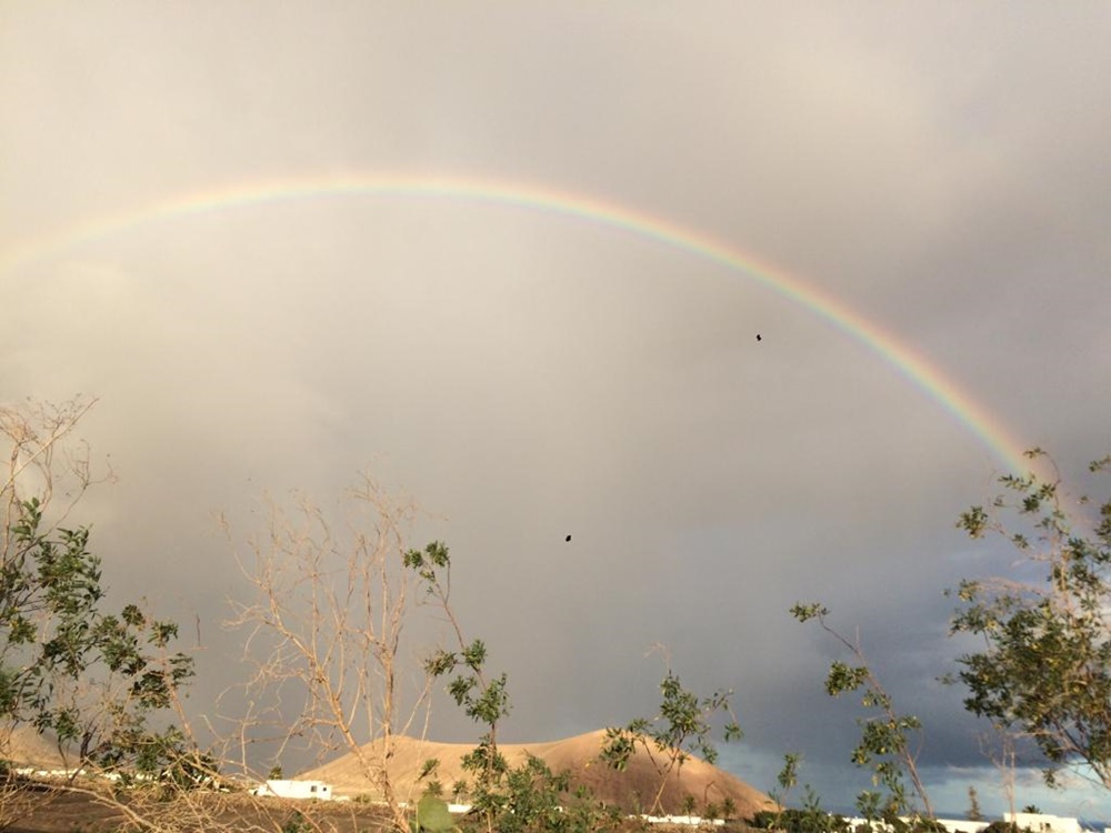 Esta mañana Lanzarote, sobre todo la zona de Tías y Puerto del Carmen, amanecía con un chaparrón que aunque corto fue bastante intenso. El arcoiris que dejó tras el paso de esta descarga de agua, ha sido recibido como un regalo por los que por allí pasaban.