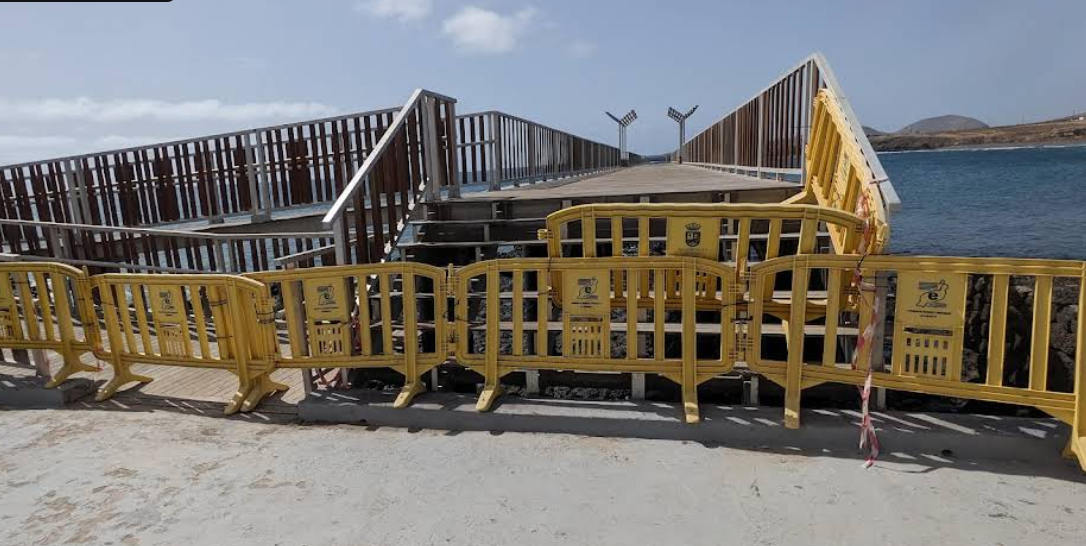 La pasarela peatonal que después de su inauguración ha estado más tiempo rota por los efectos del oleaje que en uso, sigue abandona a su suerte. Compromiso por Haría durante su gestión subsanó ciertos desperfectos y pretendió la rehabilitación añadiendo incluso como mejora la iluminación para una mayor seguridad durante la horas nocturnas, para ello se encargó y redactó el correspondiente proyecto ahora olvidado en los despachos del Ayuntamiento.