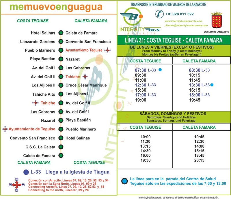La línea 31 une Costa Teguise con Famara, con un nuevo recorrido por distintos hoteles y por la Fundación César Manrique, pasando por los pueblos de Tahiche, Nazaret y La Villa, con parada en el Ayuntamiento y en el Centro de Salud de Teguise