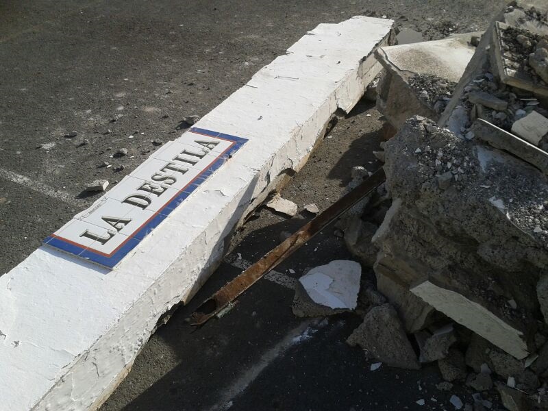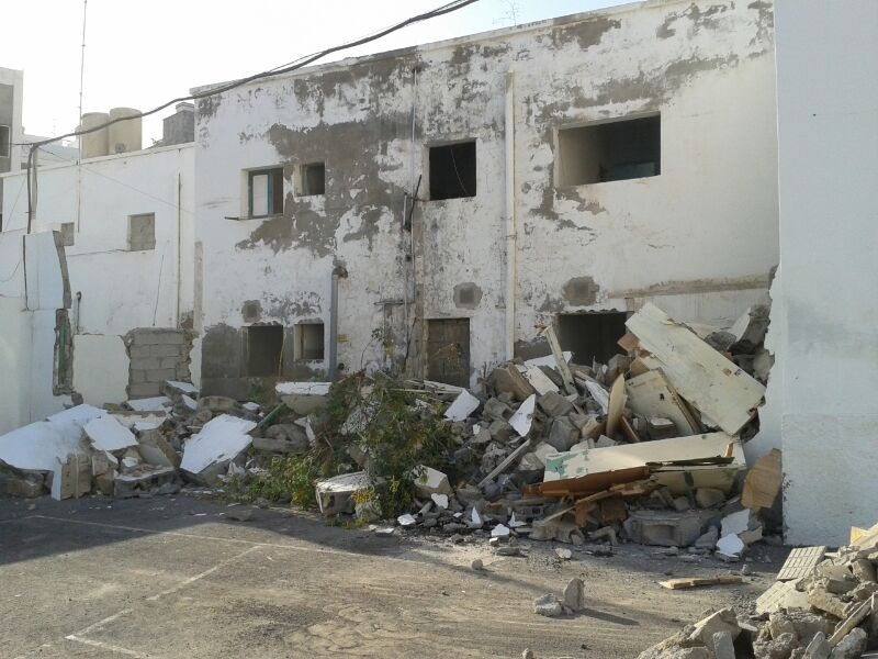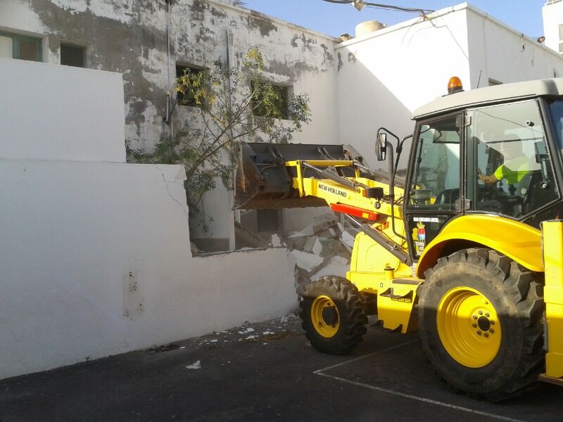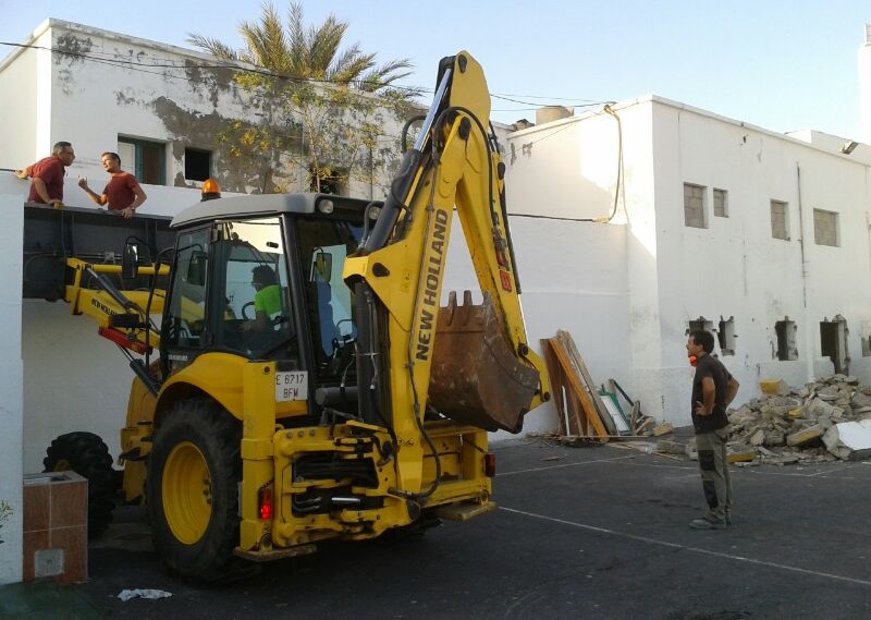 El derribo de las casas del colegio de La Destila ya ha comenzado. Operarios de la Concejalía de Vías y Obras del Ayuntamiento de Arrecife han iniciado a las 8 horas de este miércoles las tareas de demolición.