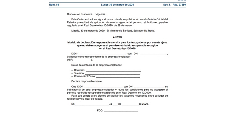 Desde este martes, todos los trabajadores de servicios especiales que deban acudir al trabajo tendrán que hacerlo con un documento de declaración responsable que emite la empresa, según recoge el Real Decreto-ley 10/2020 El Boletín Oficial del Estado (BOE) del 30 de marzo de 2020 publicó un modelo de este certificado.