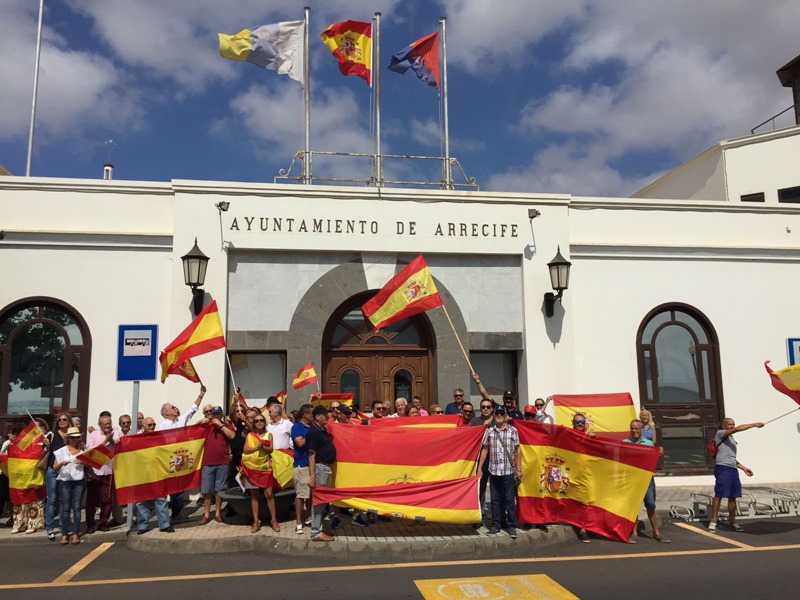 En la capital lanzaroteña se han concentrado en el Consistorio y después han recorrido la Calle Real ondeando la bandera española. Además de la presidenta popular, también el alcalde de Tías Francisco Hernández o el portavoz popular en el ayuntamiento capitalino, Jacobo Medina, participaron del acto.
