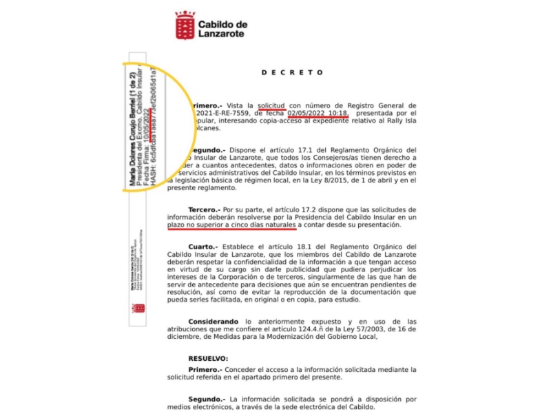 De hecho, los consejeros del Grupo Popular en el Cabildo de Lanzarote hacían público el decreto que certifica que la presidenta Dolores Corujo dio acceso al expediente del "caso del Rally" el 10 de mayo, a las 12,00 de la mañana, con posterioridad a que el Partido Popular denunciara en nota de prensa la ocultación del citado expediente.