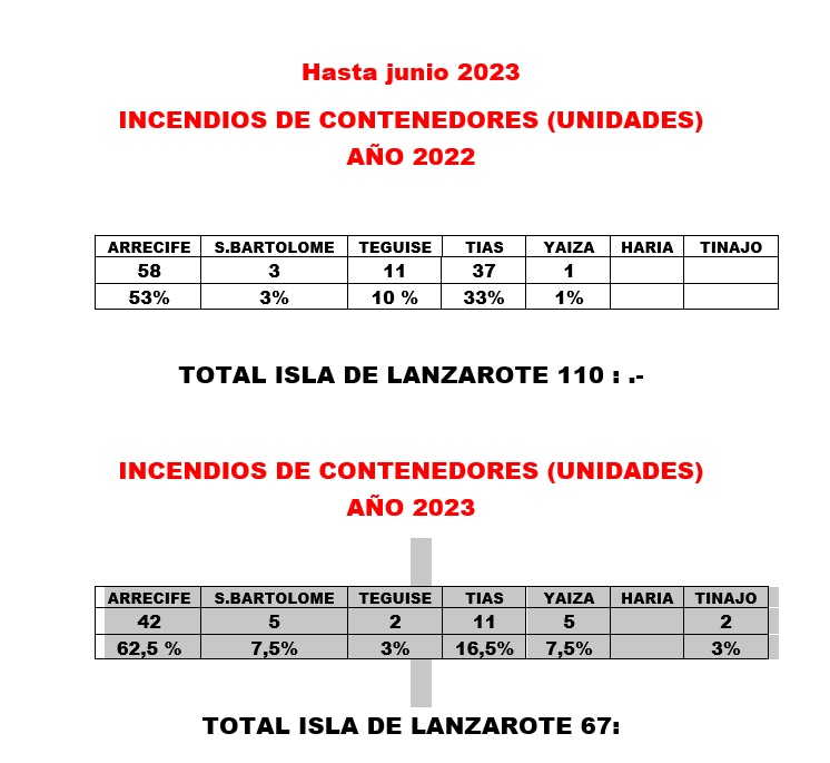 De esos 67 contenedores quemados hasta este 7 de julio, 42, el 62%, fueron en Arrecife; 5 en San Bartolomé; 2 en Teguise; 11 en Tías; 5 en Yaiza y 2 en Tinajo. En Haría no se quemó ninguno.