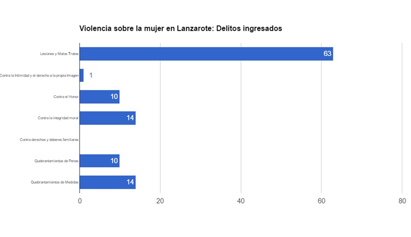 De las 112 denuncias que se presentaron, 63 fueron por lesiones y malos tratos, 14 por delitos contra la integridad moral, otras 14 por quebrantamiento de medidas, 10 por quebrantamiento de penas, otra decena por delitos contra el honor y una por delitos contra la Intimidad y el derecho a la propia imagen. Además, se ingresaron diez faltas, siete por vejación injusta y tres por injurias.