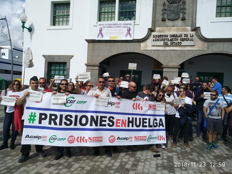 Los funcionarios de presiones continúan con sus protestas por todo el territorio nacional, también en Lanzarote. En concreto los trabajadores del centro penitenciario de Tahiche se concentraron este viernes frente a la Dirección Insular de la Administración del Estado en Lanzarote, haciendo llegar al representante del Estado en la Isla, Juan Ramón Pérez, sus reivindicaciones.