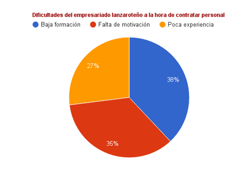 Los resultados del estudio revelan que el 38% del empresariado de Lanzarote considera que la mayor dificultad que se encuentra a la hora de contratar personal es la baja formación, seguido de la falta de motivación (35%) y, por último, la poca experiencia (27%).
