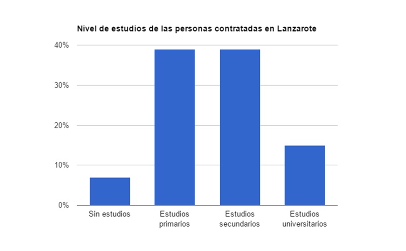 Según este estudio, cuatro de cada diez empresas han ampliado su plantilla en la primera parte del año 2016, es decir, el 39% de la empresas de la isla. Llama la atención que estos porcentajes se incrementan de forma significativa en el subsector de los restaurantes, que alcanza el 61%, y en los hoteles, que llega al 80%. El 39% del empresariado de Lanzarote ha contratado personal con estudios primarios y también el 39% con estudios secundarios. Por otro lado, el 15% de las personas contratadas tenía estudios universitarios y solo el 7% no tiene estudios.