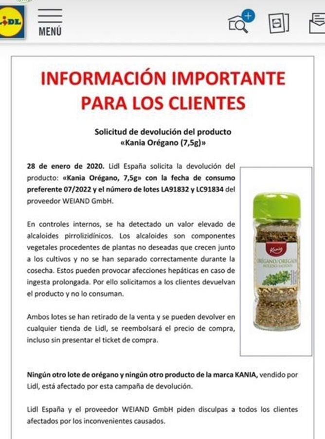 La cadena de supermercados Lidl España ha emitido este viernes una alerta dirigida a los consumidores tras detectar que dos lotes de orégano molido de la marca Kania presentaban valores elevados de una toxina.