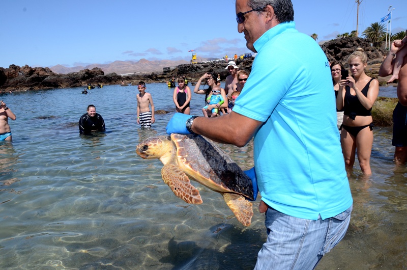 Dos tortugas marinas han sido este jueves devueltas a su hogar. El Área de Medio Ambiente del Cabildo de Lanzarote, con la colaboración del Club de Buceo Timanfaya Sub, procedían este jueves en Playa Chica a la puesta en libertad de estos ejemplares que fueron entregadas con diversos daños en el Aquarium y recuperadas allí de sus lesiones.
