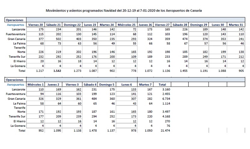 El domingo 22 de diciembre, los movimientos programados fueron 201, el domingo 29 de diciembre, 189 movimientos y el jueves 26 de diciembre, un total de 173 movimientos previstos. Tanto las operaciones programadas como el número de plazas ofertada en el aeropuerto César Manrique son parecidas a las del año pasado.